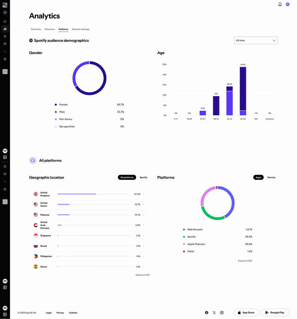 Dive deeper into who is tuning in with the Audience dashboard. Spotify surfaces demographic slices like gender and age brackets alongside geographic distribution by country.