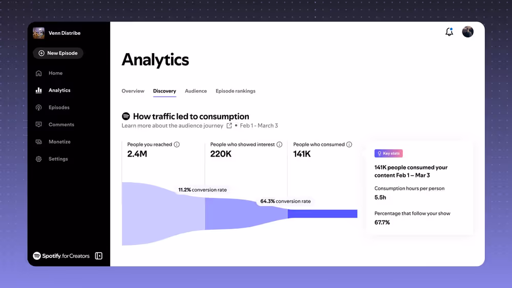 The Discovery view breaks down how listeners are finding your show. Whether they stumble upon you via Spotify search, tap in from personalised recommendations, browse your show’s page directly, or click through from external embeds, this dashboard quantifies each source.